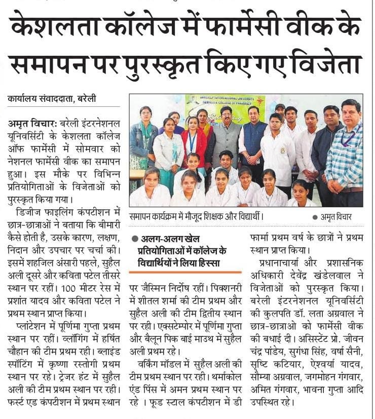 It is is easy to get thousands of prescriptions, but hard to get one single remedy. Keshlata college of pharmacy is a constituent of Bareilly International University, Bareilly. The College was set up in the year 2018 stands deeply committed clenched ideals of right knowledge, right philosophy and right conduct is essential in all the spheres of activity with the goal of making new age registered pharmacists to take up new step ups in pharmaceutical and medication industry and clinical drug store. The college is profoundly dedicated to form quality experts with character and skill to contact the mankind with a merciful heart. The institute offers a two years pharmacy course D.Pharm – Diploma in Pharmacy